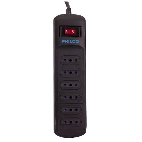 Extensión eléctrica Tipo Zapatilla con cable de 150cm Con Switch On/Off y 6 Entradas. Es Protector de Sobrevoltaje hasta 918 Joules. Marca Philco, Modelo P9186, Color Negro.