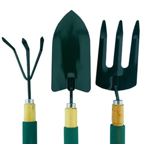 – Set de tres herramientas para jardín (Pala, cultivador, rastrillo de mano), mango madera con anti-resvalante y bases metálicas.